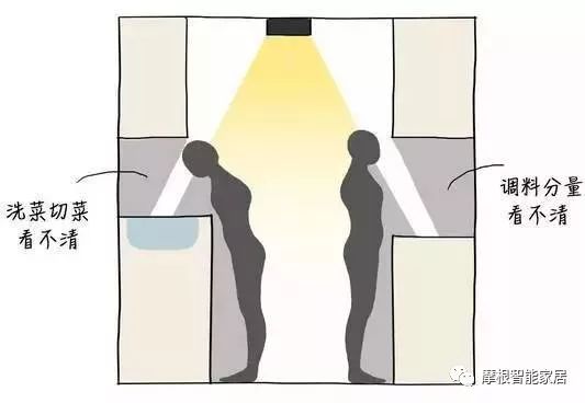 当你切菜煮饭的时候就会发现,你刚好挡住了吸顶灯下的光,面对的地方都是一片阴影。